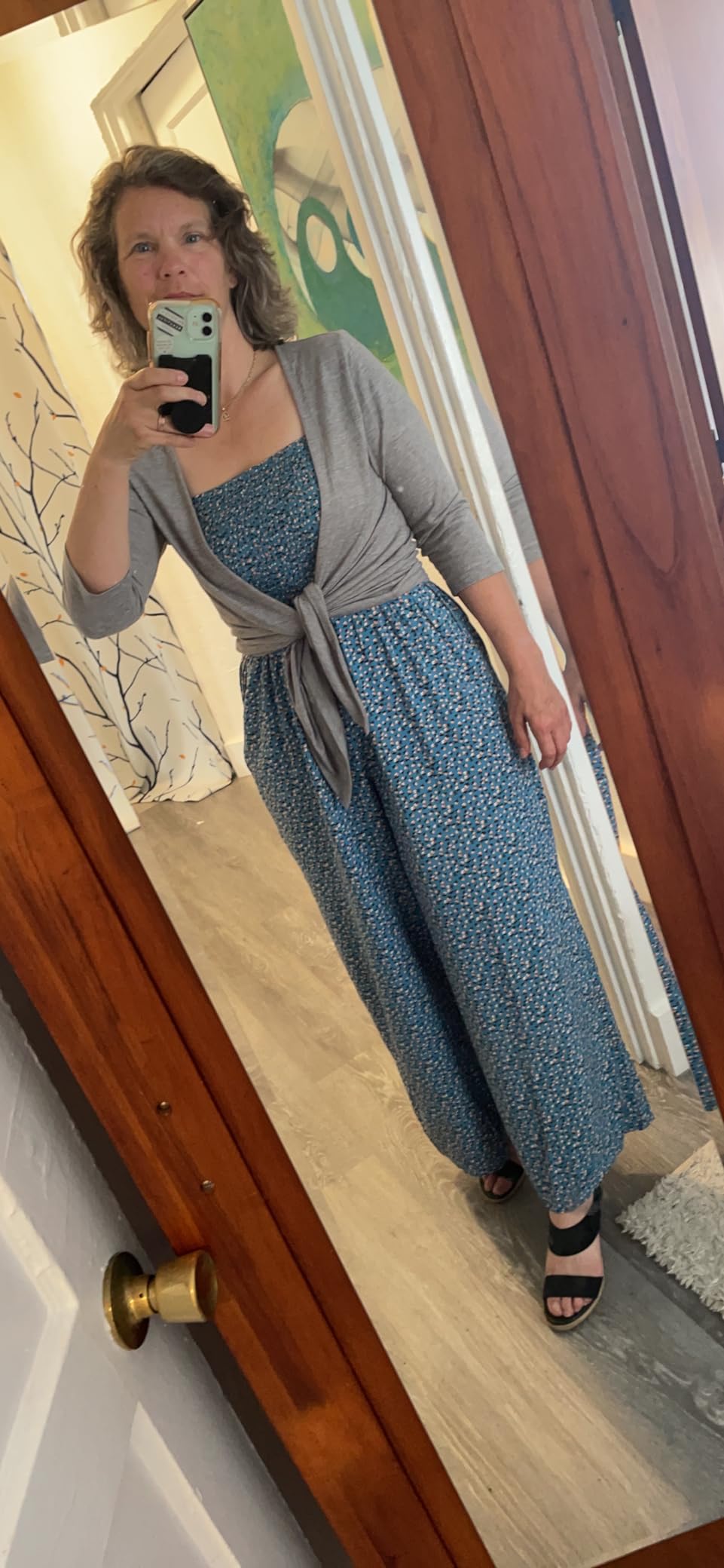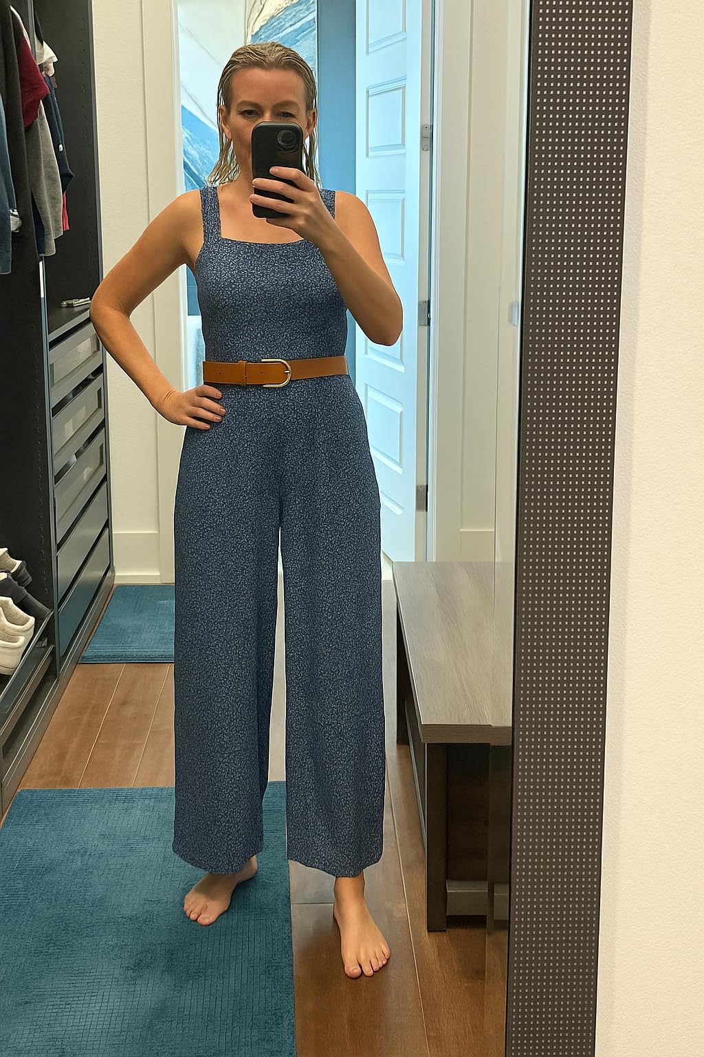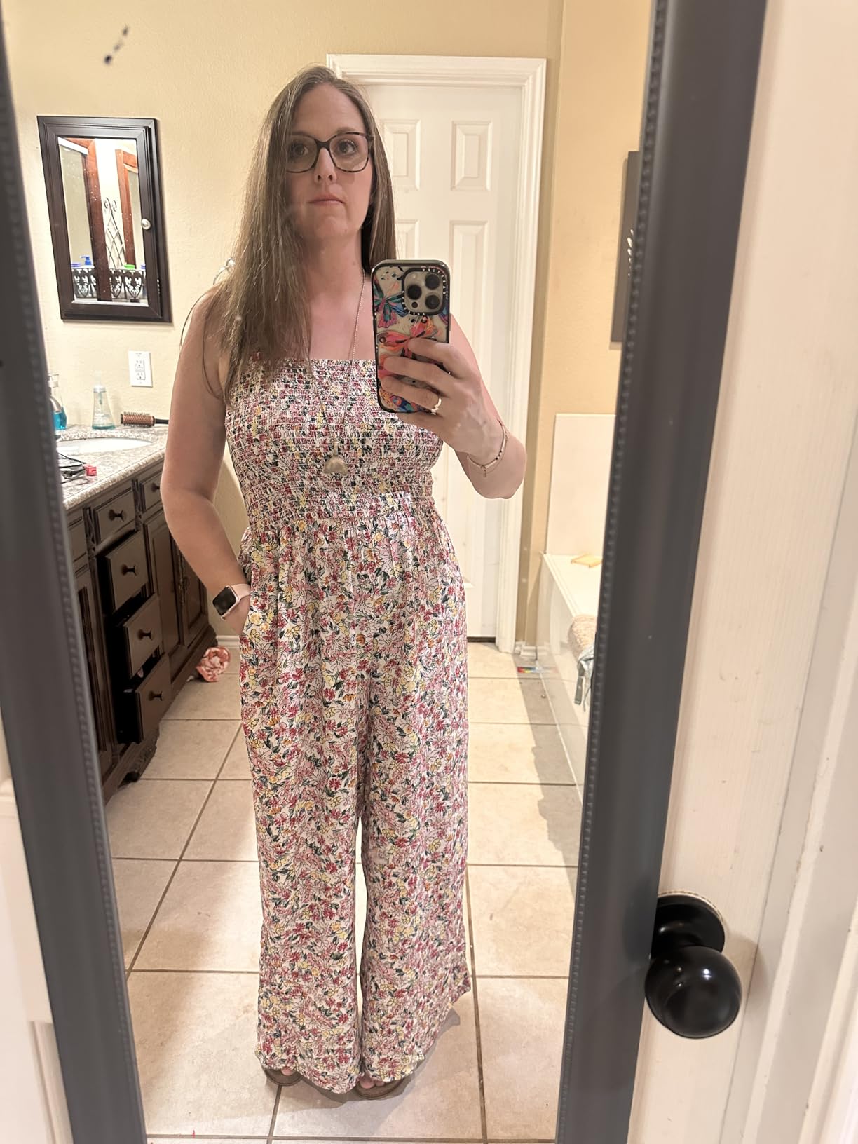 I’m 5’7”, 130 lbs, slightly pear-shaped, and usually struggle with wide-leg styles making me look boxy. This one works. The smocked top hugs just enough to give shape, and the square neckline keeps it flattering (and bra-friendly). The legs are loose and breezy without overwhelming me, and the fabric is lightweight but not see-through. I’ve worn it straight from errands to dinner and it just feels easy. It does wrinkle a bit out of the wash, but nothing a quick steam can’t fix. I am going to add a belt (once I find the right one) and a jean jacket will bring this into fall for me (Central Texas is still so freaking hot in September!) I’ve already gotten a couple of compliments on it, and I like it so much I’m eyeing another color. If you’re tall-ish and pear-shaped like me—this is a win.